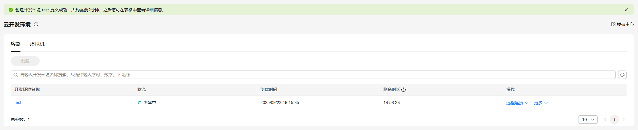 提交成功,状态为创建中,云开发环境(容器)创建大约需要 2 分钟。云开发环境(容器)创建完成后,其状态变更为已就绪。