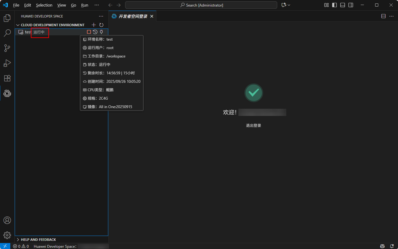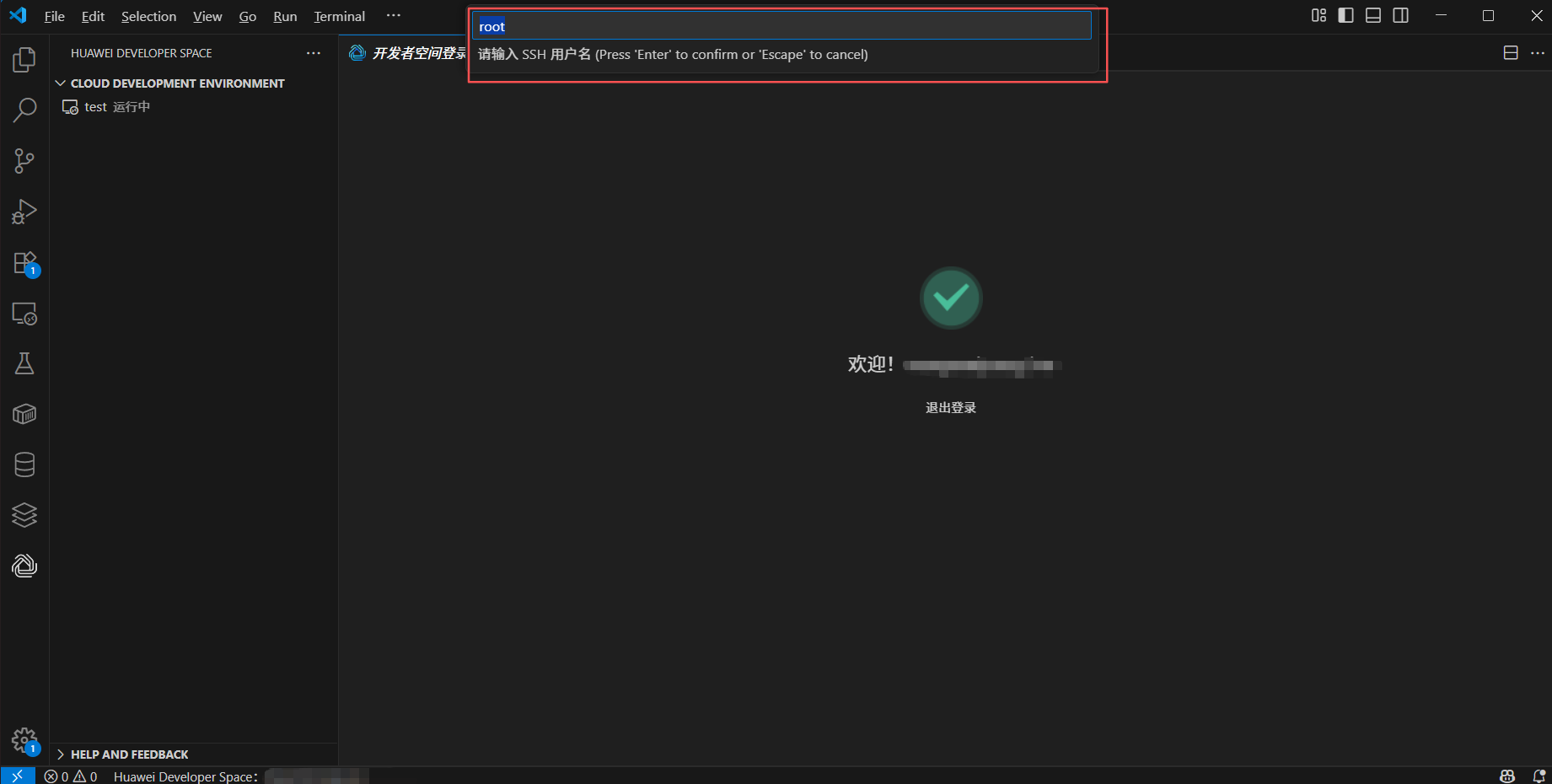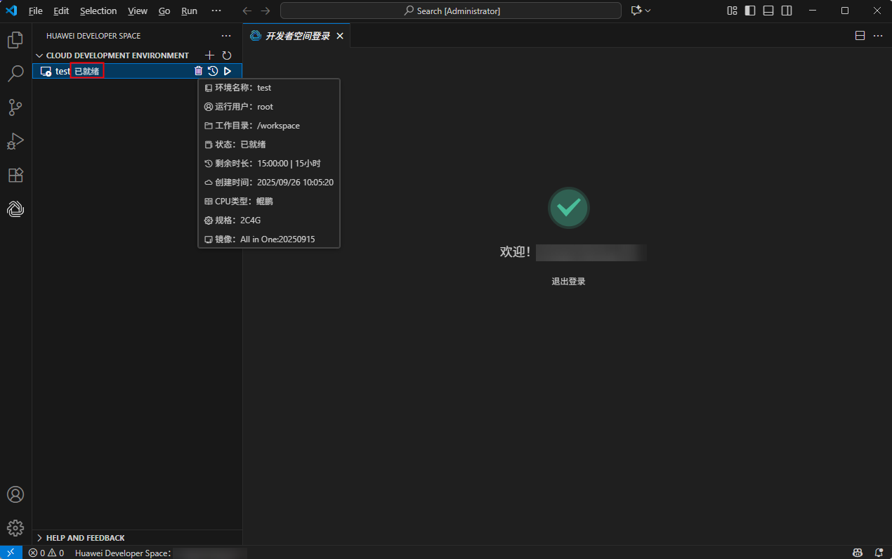 前提环境:Google 浏览器、Visual Studio Code 1.104.1、云开发环境(容器)“test”(参考“二、云开发环境(容器)操作指导”中“1. 创建云开发环境(容器)”创建)