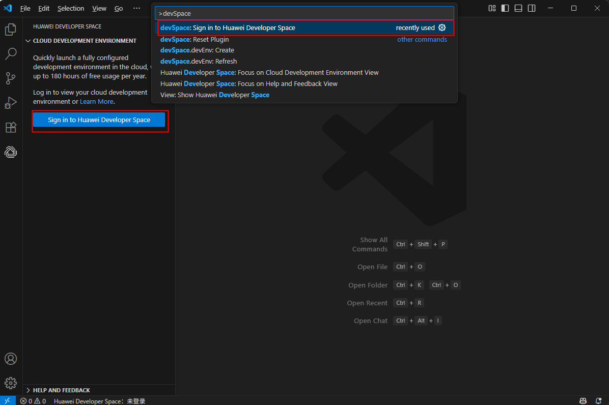 可以通过 VS Code 中 Huawei Developer Space 插件的 Sign in to Huawei Developer Space 打开;