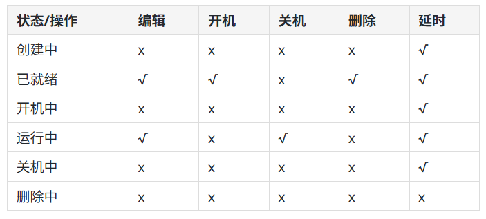 云开发环境(容器)的状态包含已就绪和运行中两个持久状态,以及创建中、开机中、关机中、删除中等流转状态。其常规操作包含编辑、开机、关机、删除、延时等。