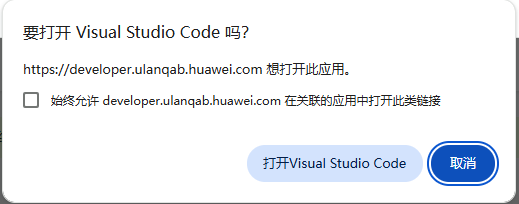 若 VS Code 已经在 PC 本地安装,Google 浏览器将会提示“要打开 Visual Studio Code 吗?”,点打开 Visual Studio Code。