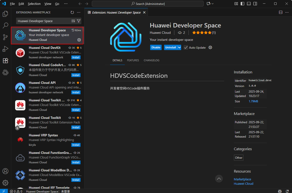 也可以选择手动安装,打开 VS Code,在插件市场搜索 Huawei Developer Space,然后点 Install。
