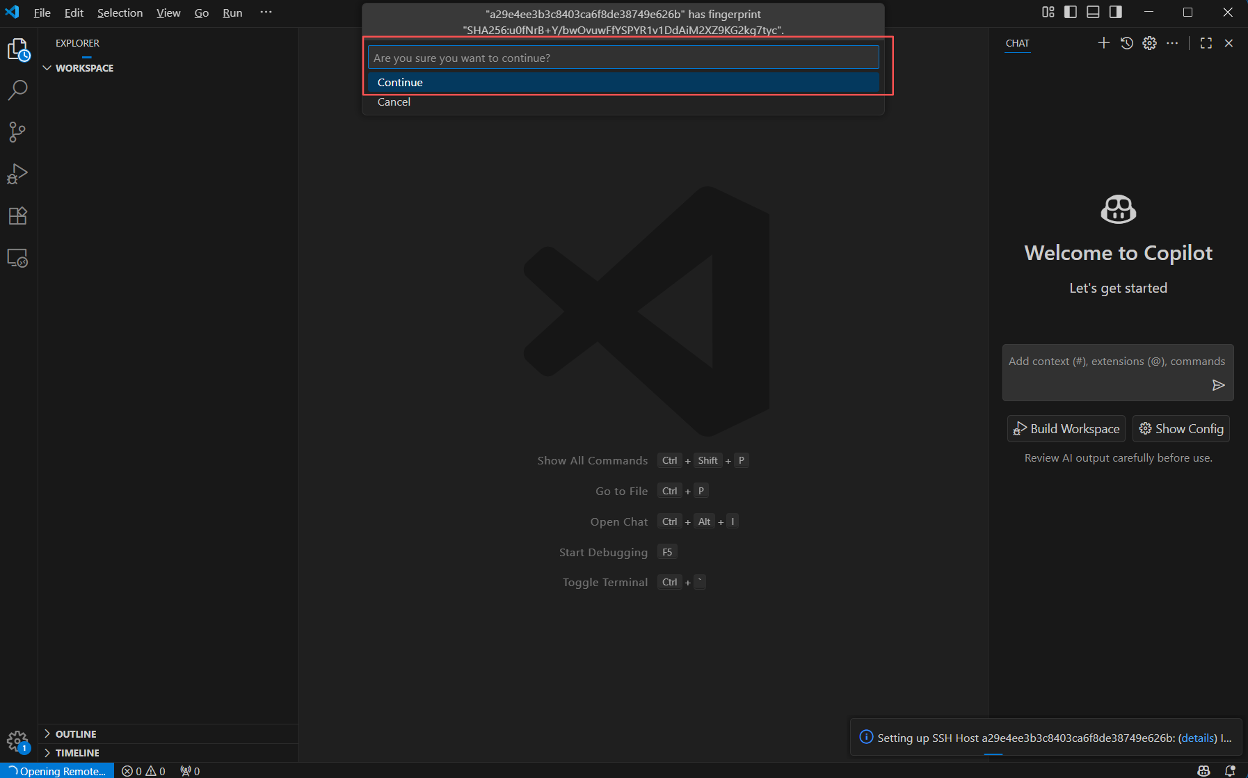Remote SSH 远程连接云开发环境(容器),通过打开操作实现。打开操作可以通过云开发环境(容器)列表中,容器右侧的 Open 按钮打开。亦或通过快捷键 Ctrl+Shift+P,在搜索框中的devSpace.devEnv:Open