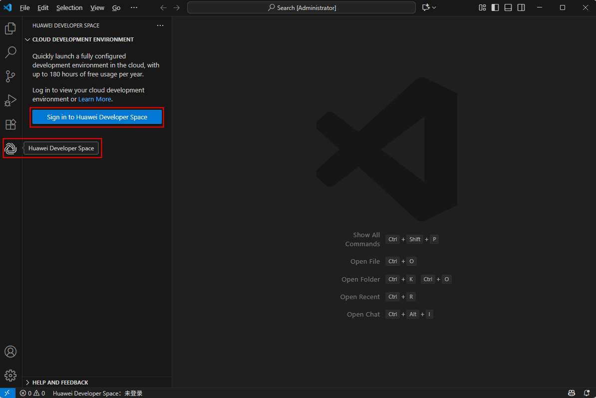 安装完成后,VS Code 左侧工具栏会增加 Huawei Developer Space 插件标志。