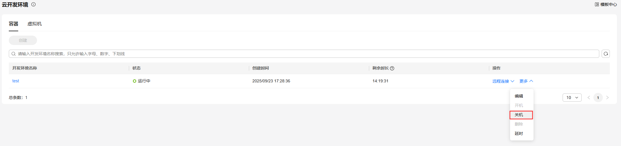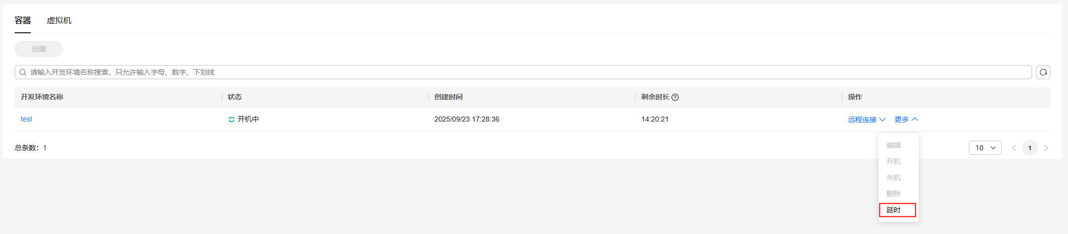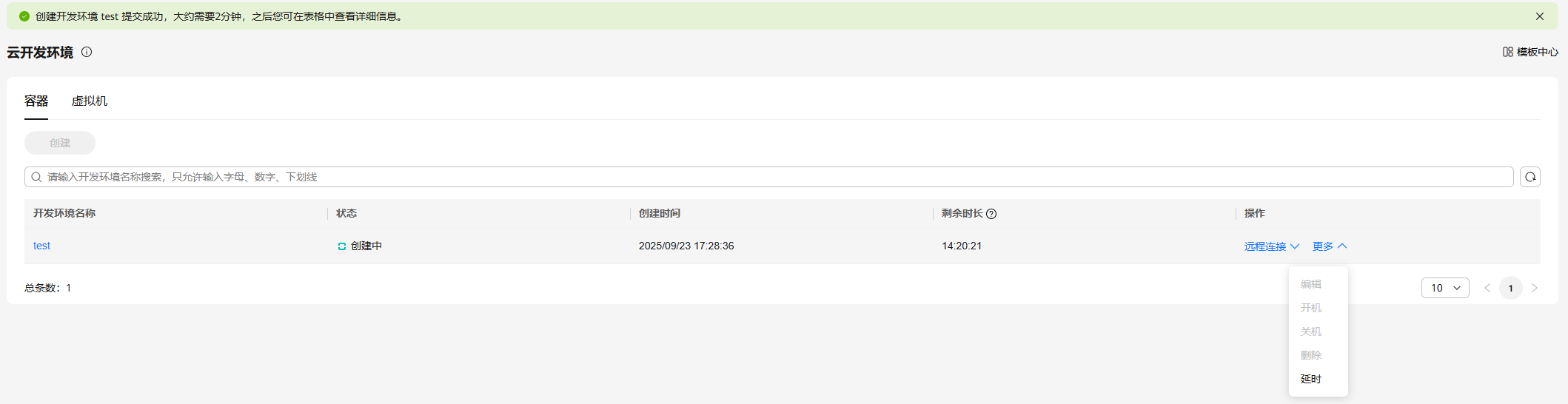 浏览器登录华为开发者空间开发平台 - 云开发环境(容器)平台,web 端实现容器的创建、编辑、开机、关机、延时、删除等操作;