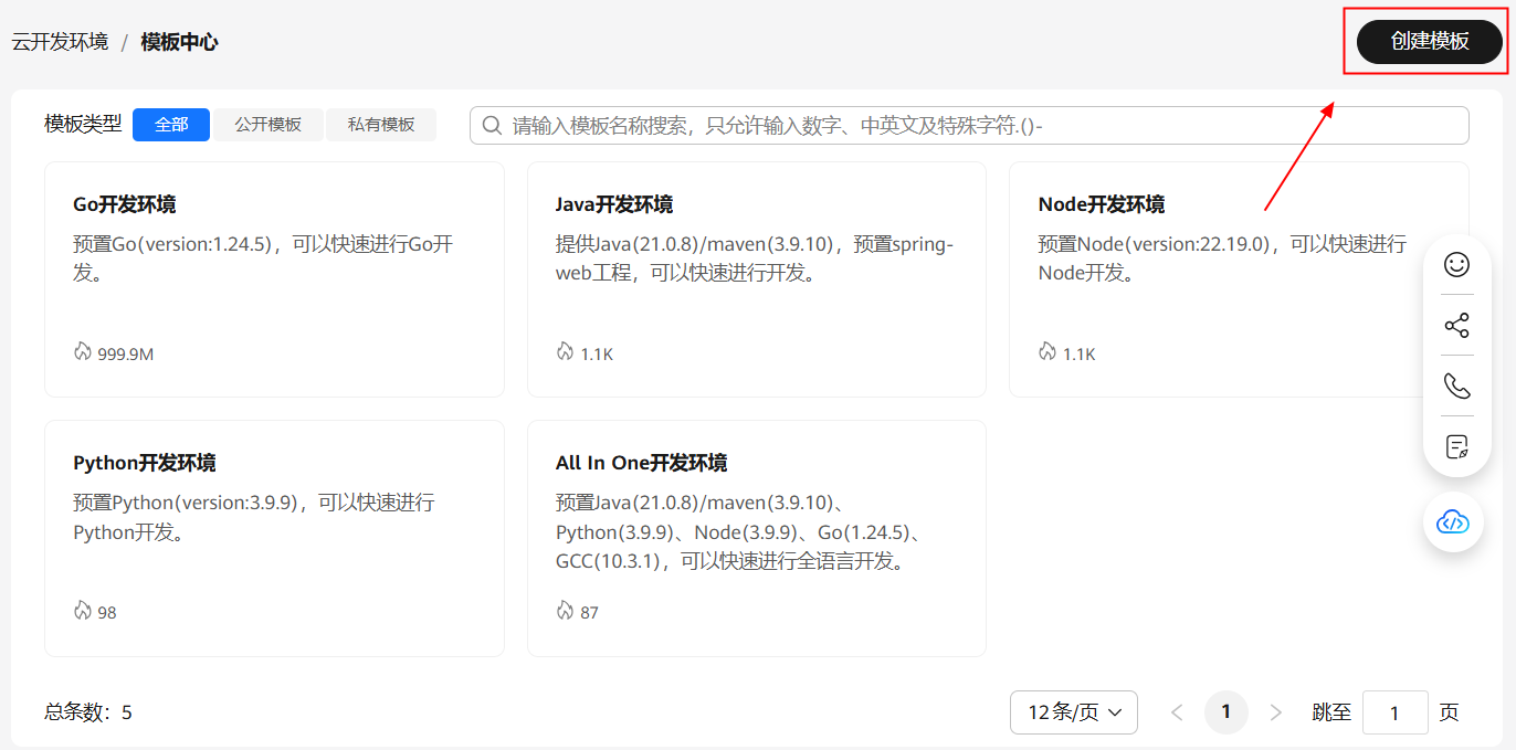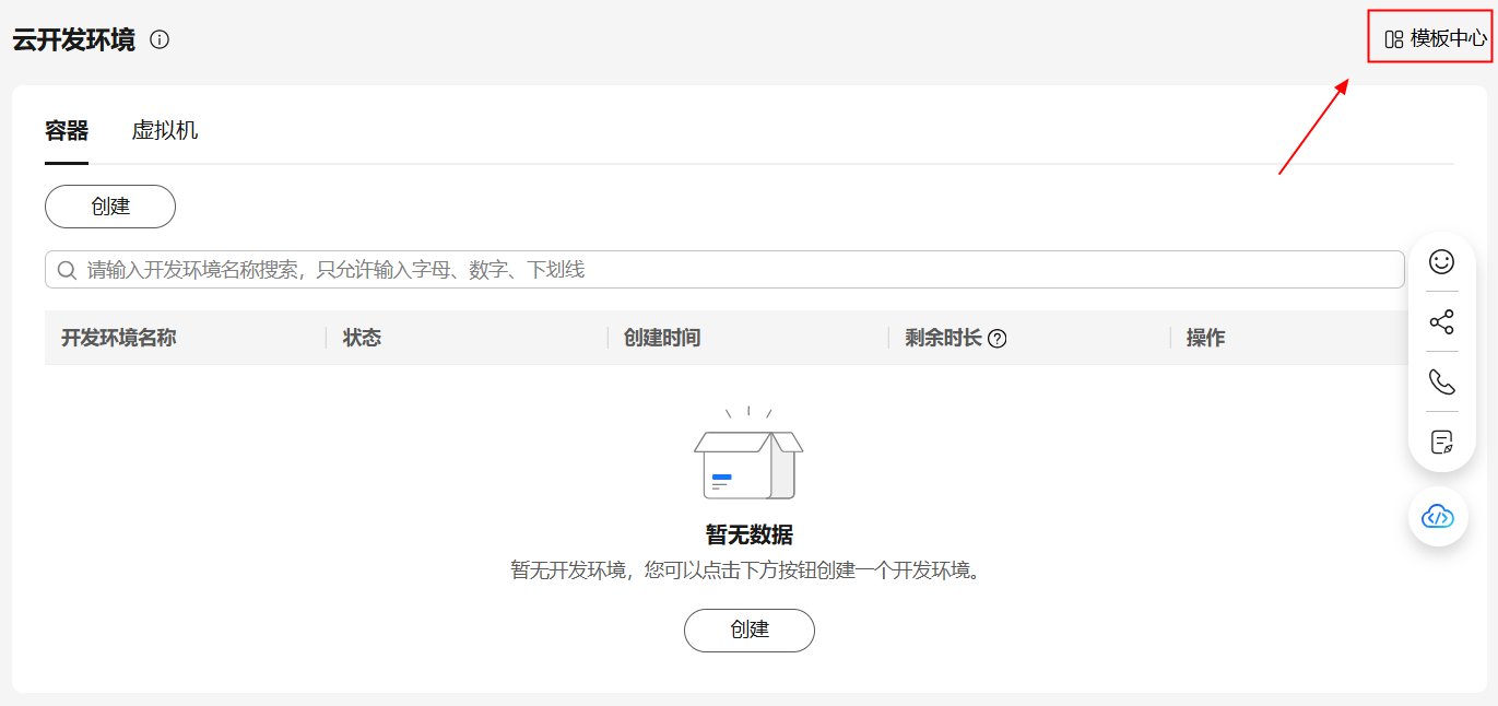 在华为开发者空间 - 云开发环境平台,点击右上角模板中心,进入模板中心。
