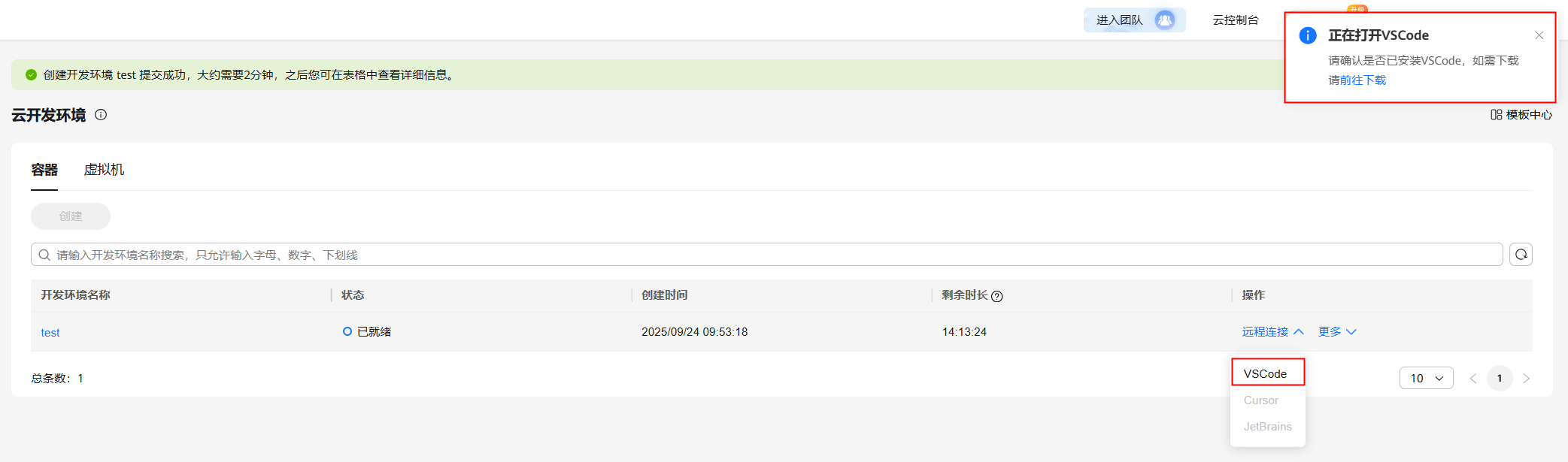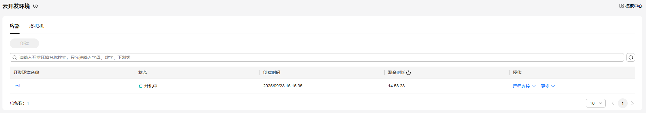 配置完成后,点下方的创建开发环境按钮,创建云开发环境(容器)test