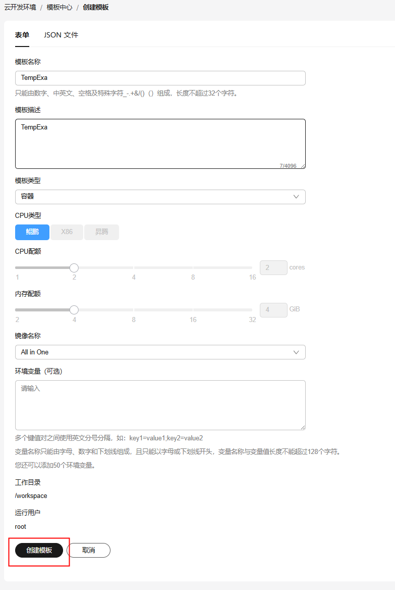 点使用模板,进入云开发环境(容器)创建页面,具体创建步骤参考“三、云开发环境(容器)操作指导”章中的“1. 创建云开发环境”。