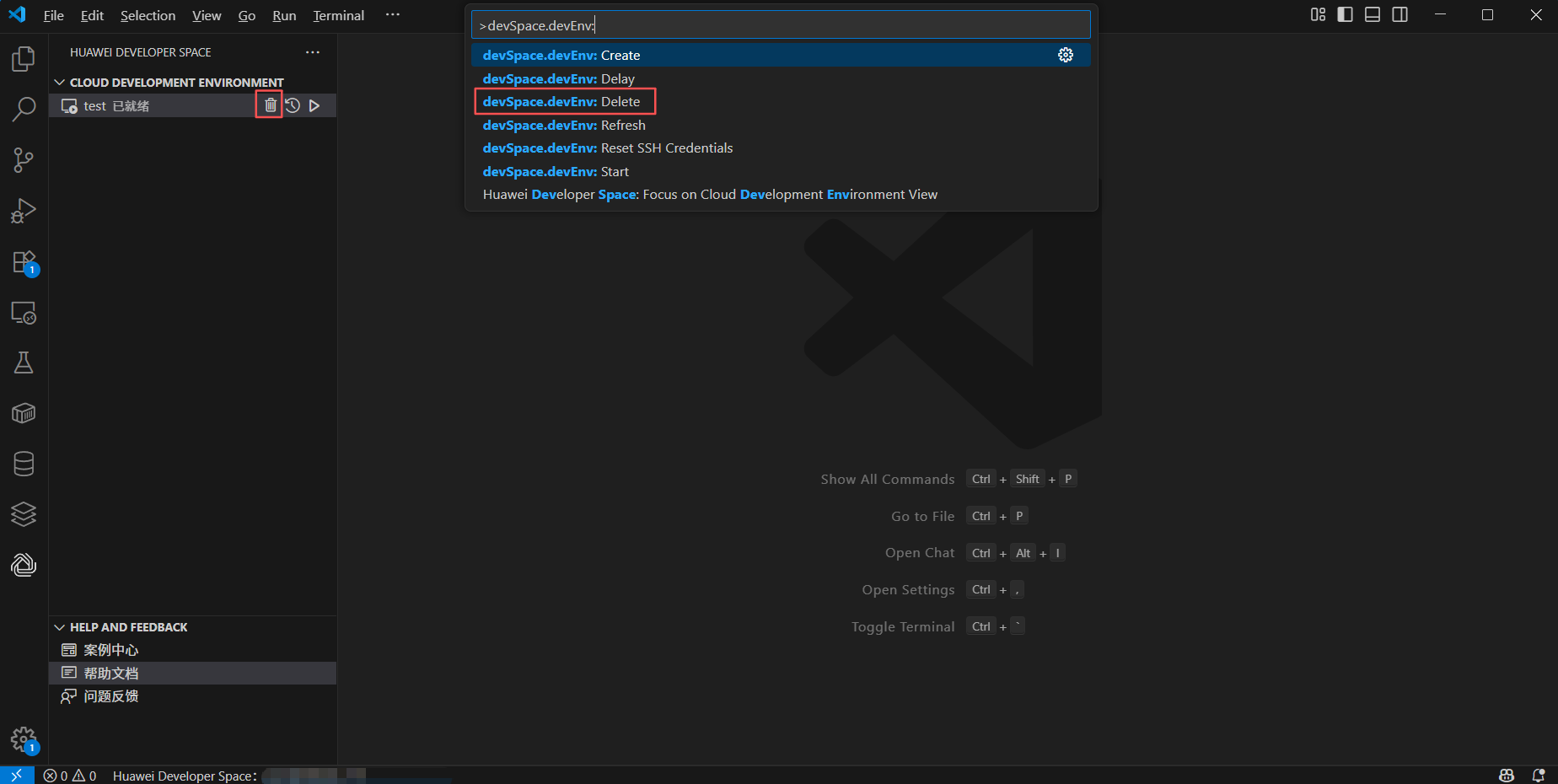 删除操作可以通过左侧的云开发环境(容器)列表中,容器右侧的删除按钮删除。亦或通过快捷键 Ctrl+Shift+P,在搜索框中的devSpace.devEnv:Delete