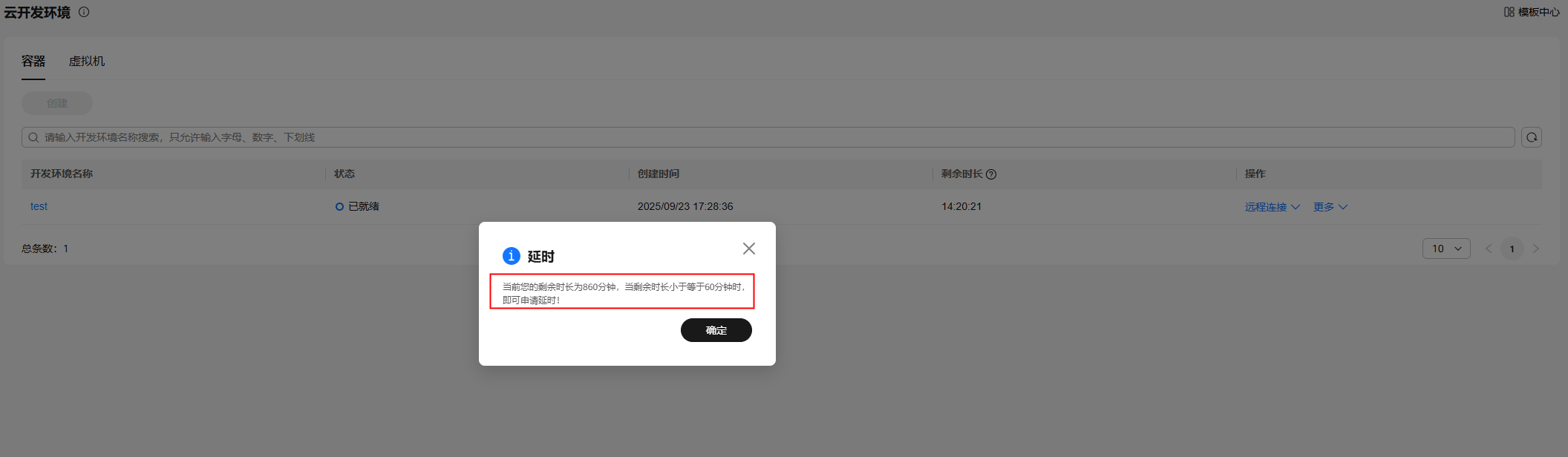 云开发环境(容器)被创建后,其使用时长为 15 小时,当用户时长小于 60 分钟时可申请延时,若时长大于 60 分钟,则不允许申请延时。