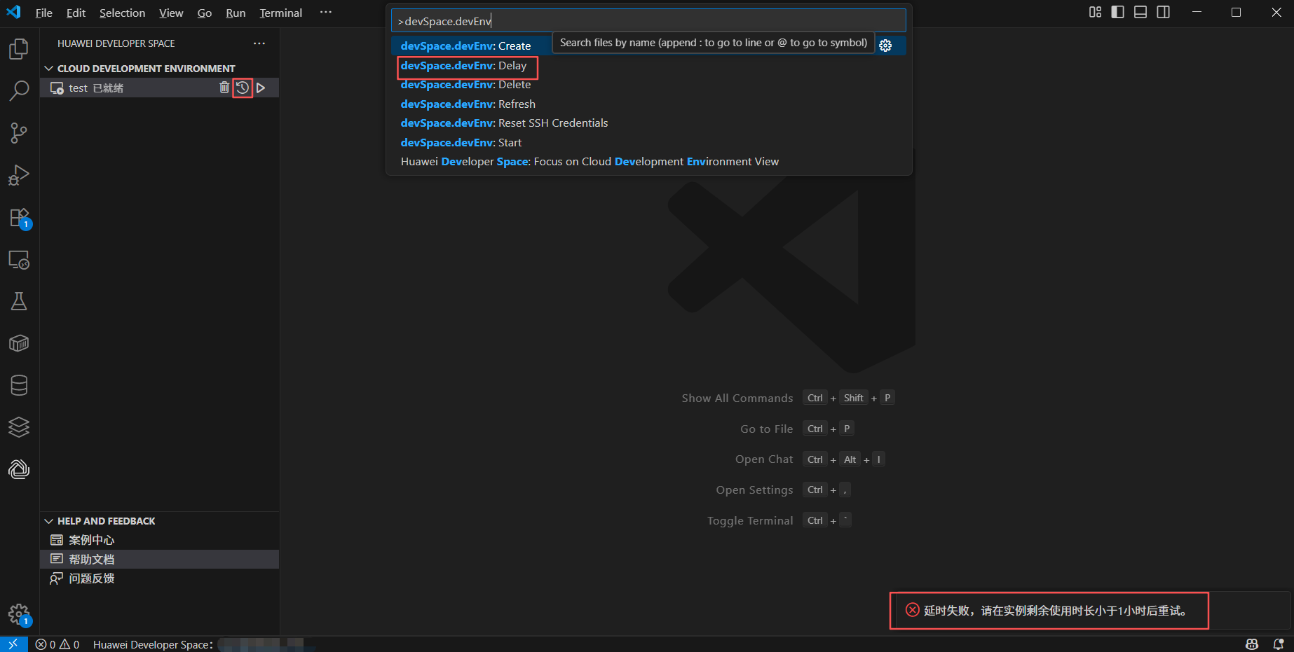 延时操作可以通过左侧的云开发环境(容器)列表中,容器右侧的延时按钮延时。亦或通过快捷键 Ctrl+Shift+P,在搜索框中的devSpace.devEnv:Delay