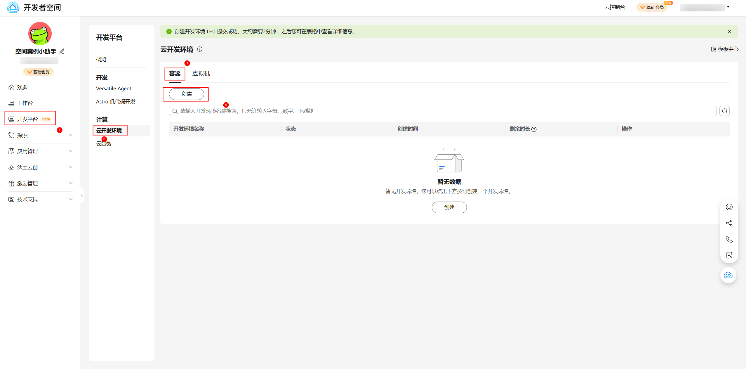 登录华为开发者空间 - 云开发环境平台,右侧页签选择容器,点击创建。