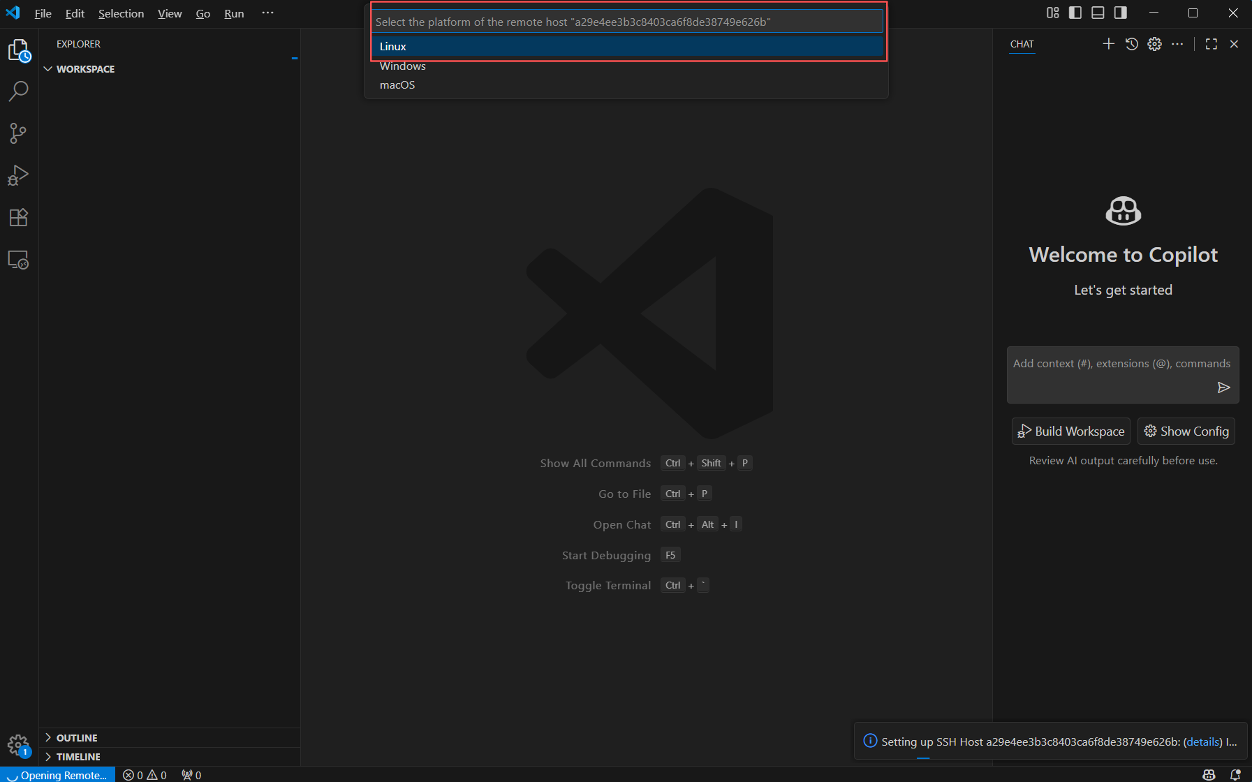 此时 VS Code 自动打开一个新的窗口,并提示选择连接的操作系统,此处选择Linux