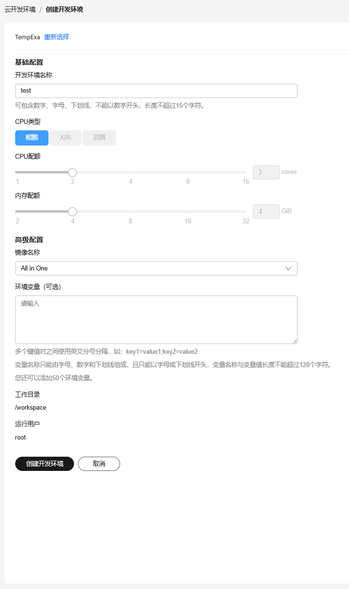 在云开发环境(容器)配置页面,基础配置板块,填写开发环境名称:test