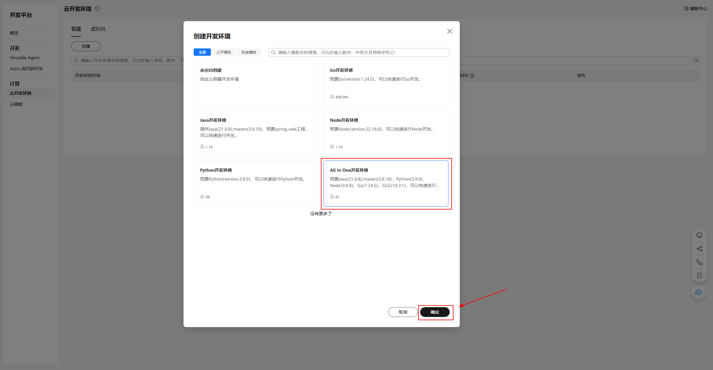 以公开模板中的 All In One 云开发环境(容器)为例,这里对其进行选中点右下角的确定。