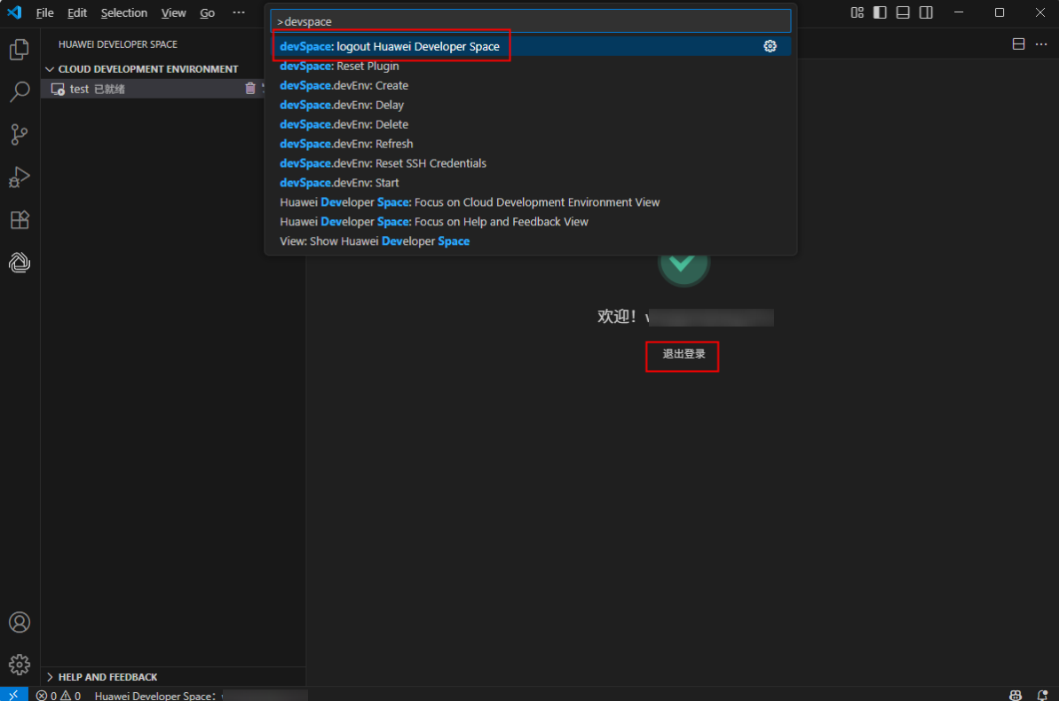 华为云开发者空间退出操作方式,可以通过欢迎页面的退出登录操作退出,也可以通过快捷键 Ctrl+Shift+P,在搜索框中找到devSpace:logout Huawei Developer Space