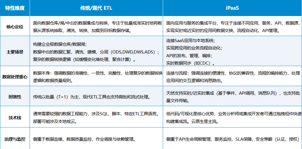 三、核心引擎:ETL 与 iPaaS 的技术路径与能力对比