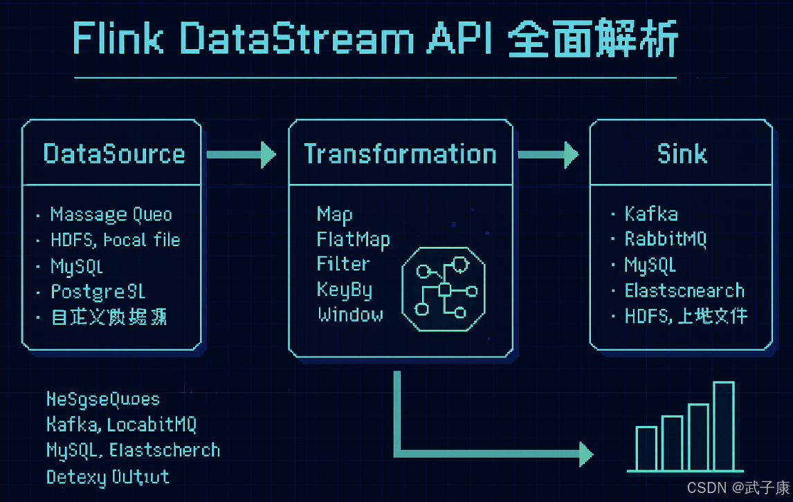 Flink 程序的数据处理流程主要分为 3 个核心组成部分: