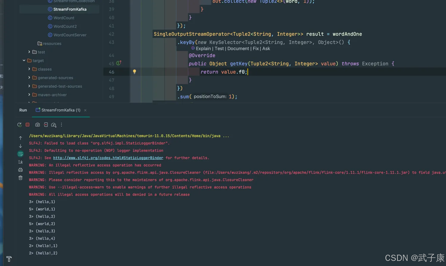 SingleOutputStreamOperator<Tuple2<String, Integer>> wordAndOne = data .flatMap(new FlatMapFunction<String, Tuple2<String, Integer>>() { @Override public void flatMap(String value, Collector<Tuple2<String, Integer>> out) throws Exception { String[] words = value.split(" "); for (String word: words) { out.collect(new Tuple2<>(word, 1)); } } }); SingleOutputStreamOperator<Tuple2<String, Integer>> result = wordAndOne .keyBy(new KeySelector<Tuple2<String, Integer>, Object>() { @Override public Object getKey(Tuple2<String, Integer> value) throws Exception { return value.f0; } }) .sum(1); result.print(); env.execute("StreamFromKafka"); }