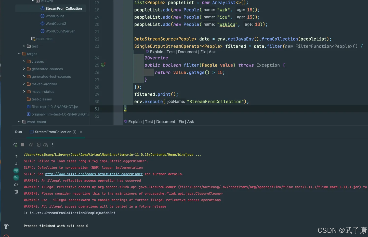 DataStreamSource<People> data = env.getJavaEnv().fromCollection(peopleList); SingleOutputStreamOperator<People> filtered = data.filter(new FilterFunction<People>() { @Override public boolean filter(People value) throws Exception { return value.getAge() > 15; } }); filtered.print(); env.execute("StreamFromCollection"); }