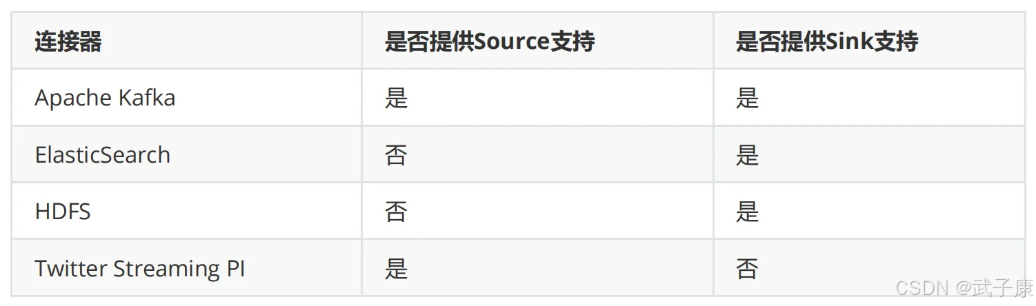 可以使用 StreamExecutionEnvironment.addSource()将一个数据源添加到程序中。Flink 提供了许多预先实现的源函数,但是也可以编写自己的自定义源,方法是非并行源:implements SourceFunction,或者为并行源 implements ParallelSourceFuction 接口,或者 extends RichParallelSourceFunctionFlink 也提供了一些内置的 Connector(连接器),如下表列了几个主要的:
