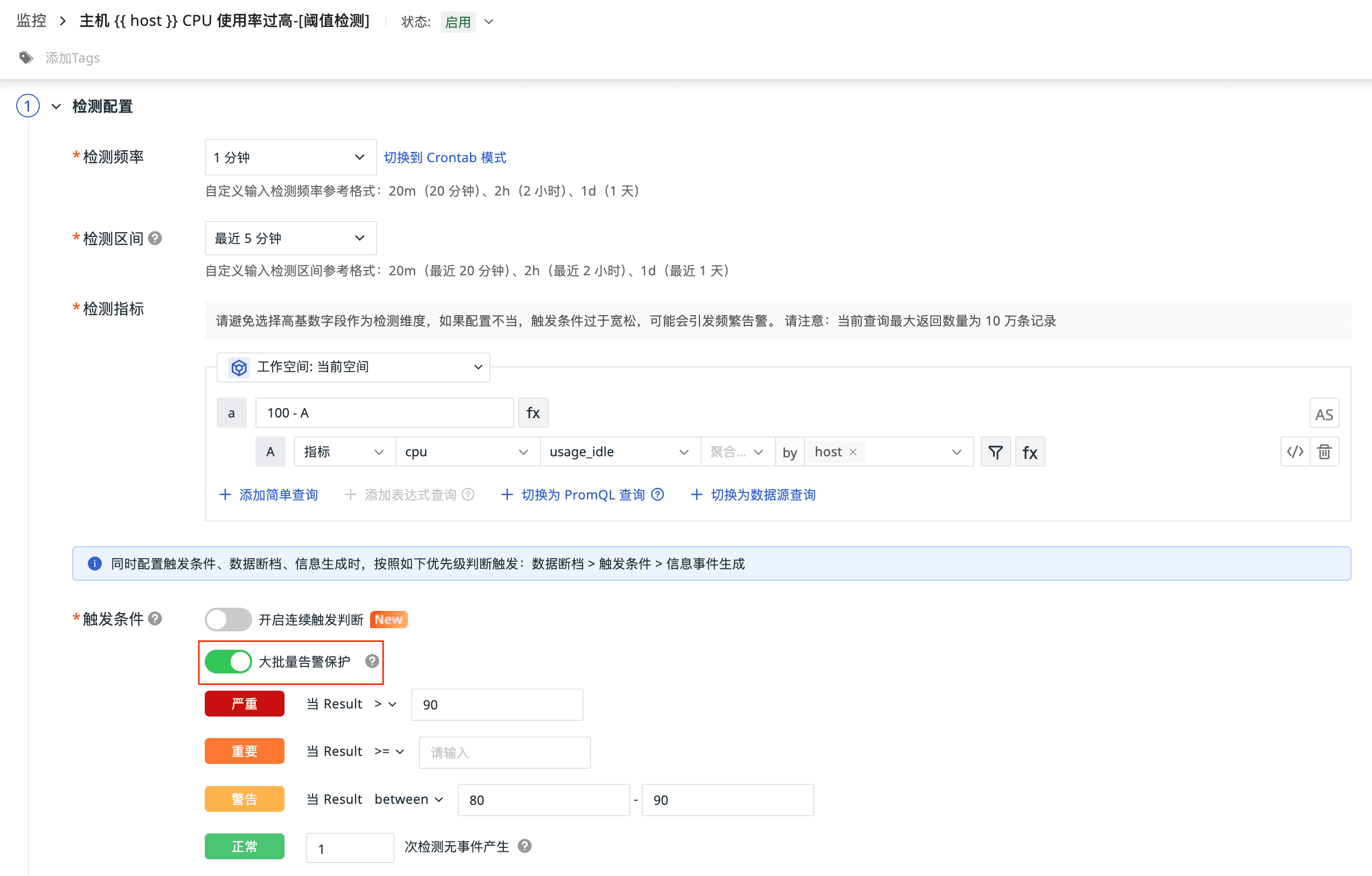新增大批量告警保护按钮:当单次检测产生的告警数量超过预设阈值时,系统会自动切换到按状态汇总策略:不再逐个处理告警对象,而是根据事件状态生成少量摘要告警并进行推送。