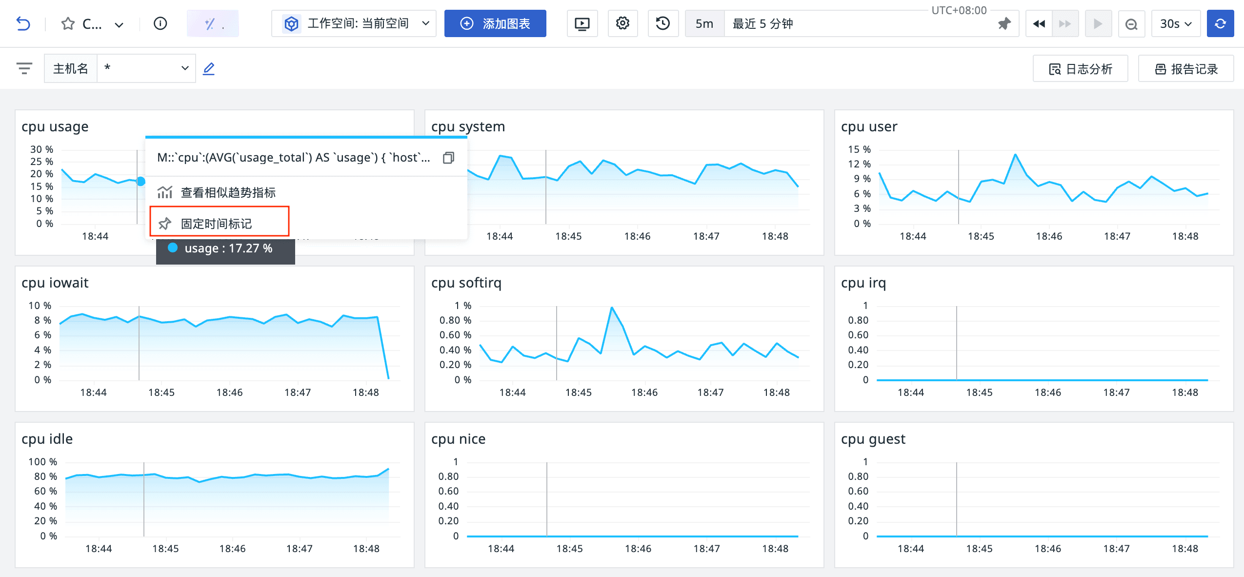 2、时序图:在时序图的目标时间点,点击可选择固定时间标记。标记设置后,不会因鼠标移动、页面滚动或切换时序图而改变。