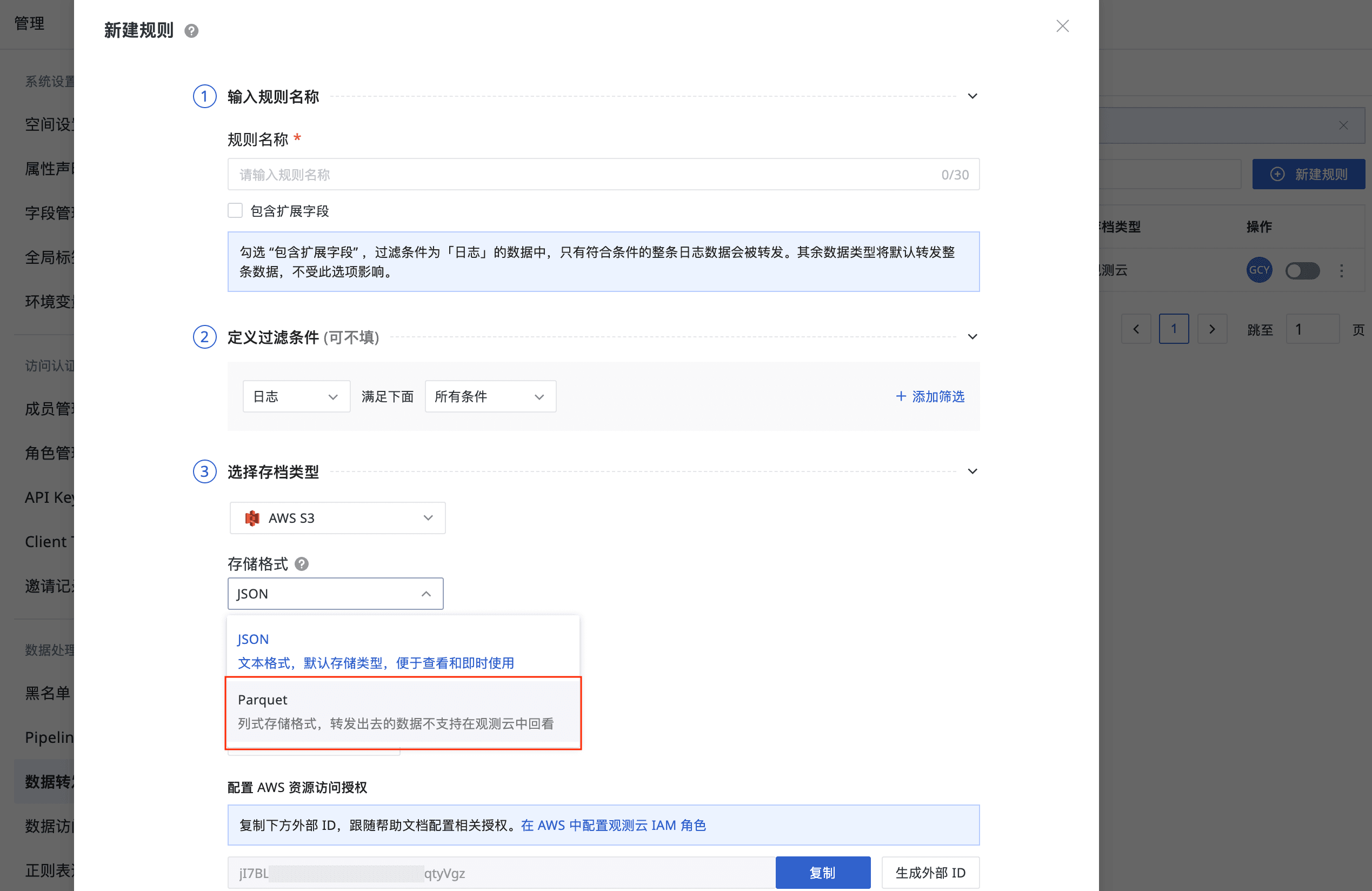 4、数据转发:JSON 文本格式的存储类型外,新增支持 Parquet 数据存储类型。