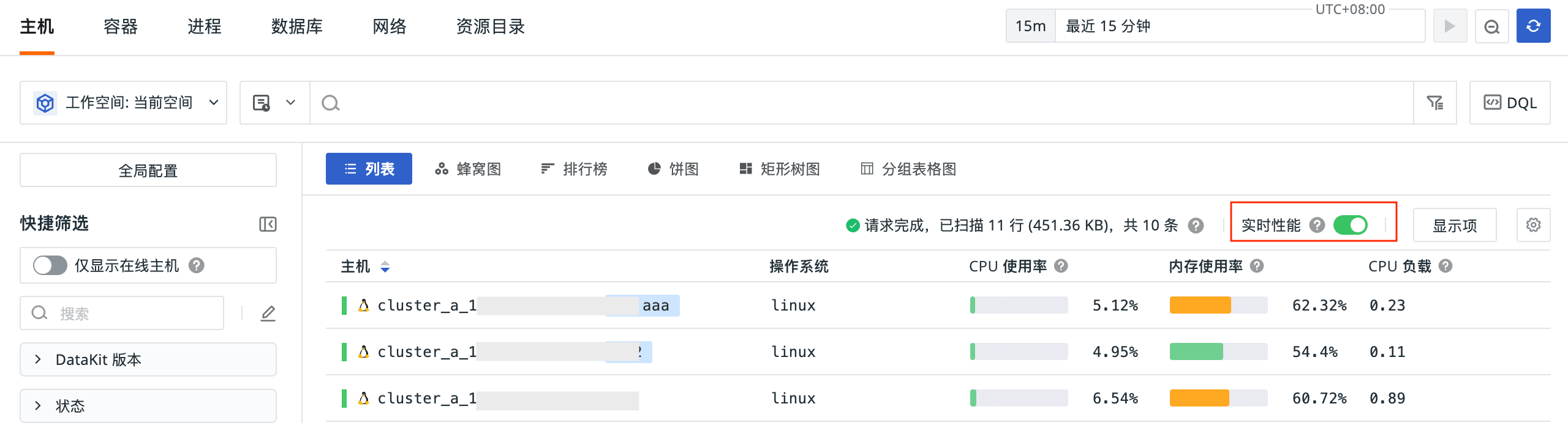 主机:新增实时性能开关。开启后,系统将每 10 秒刷新并自动获取最新的 CPU 使用率、内存使用率和 CPU 负载三个指标字段。