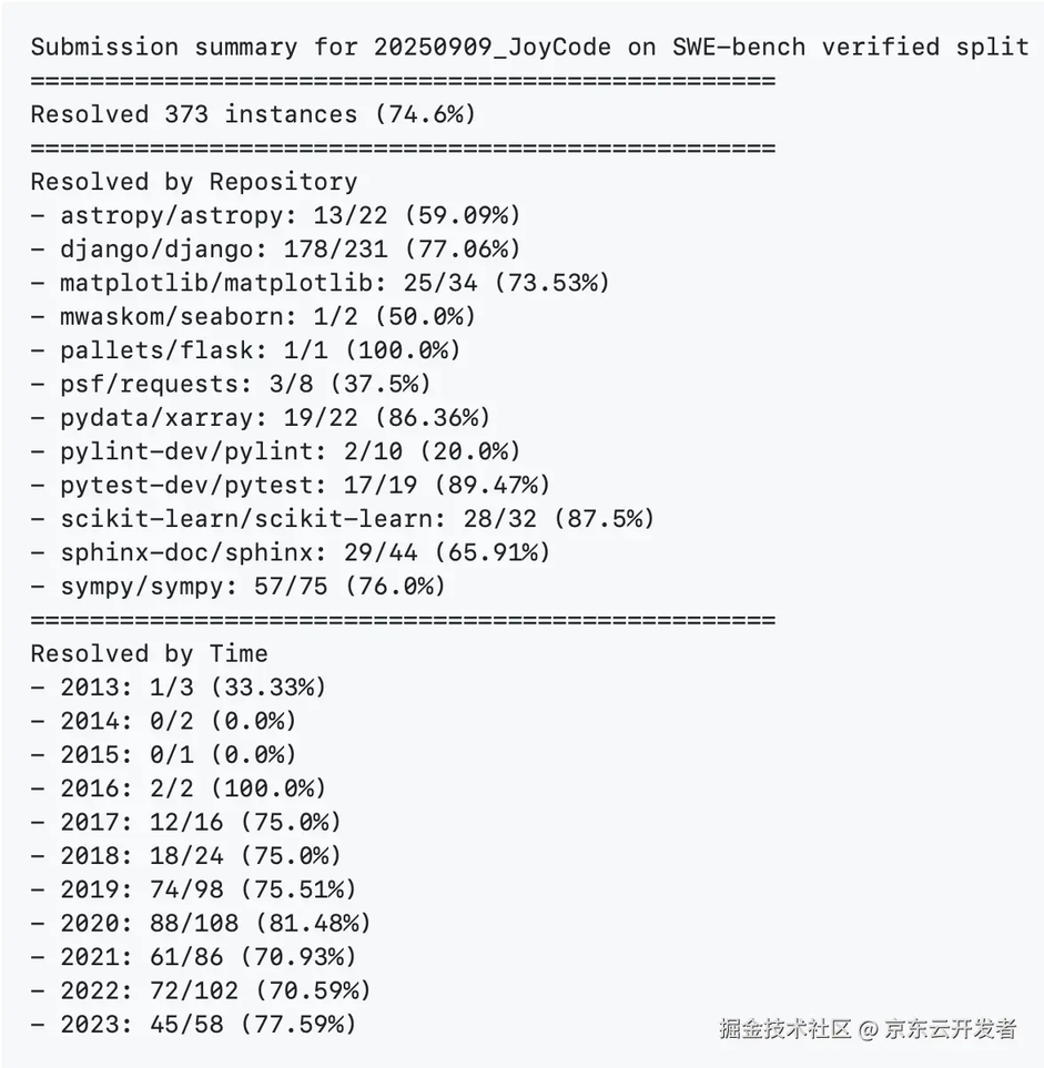 在权威 SWE-Bench Verified 基准测试中, JoyCode Agent 凭借 74.6% 的高通过率