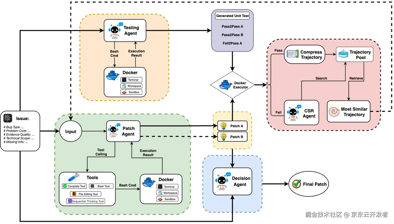 该 Agent 是系统在测试用例成功生成,但代码补丁未能通过测试用例的情况下所激活的一套高级错误诊断与自我优化的调度 Agent。它通过轨迹压缩、根因决策、CSR 相似度检索和经验重试,将第一次失败的原因和过往相似的成功经验作为第二次重试的先验知识,旨在通过借鉴多维历史经验来指导并优化新 Patch 的生成。