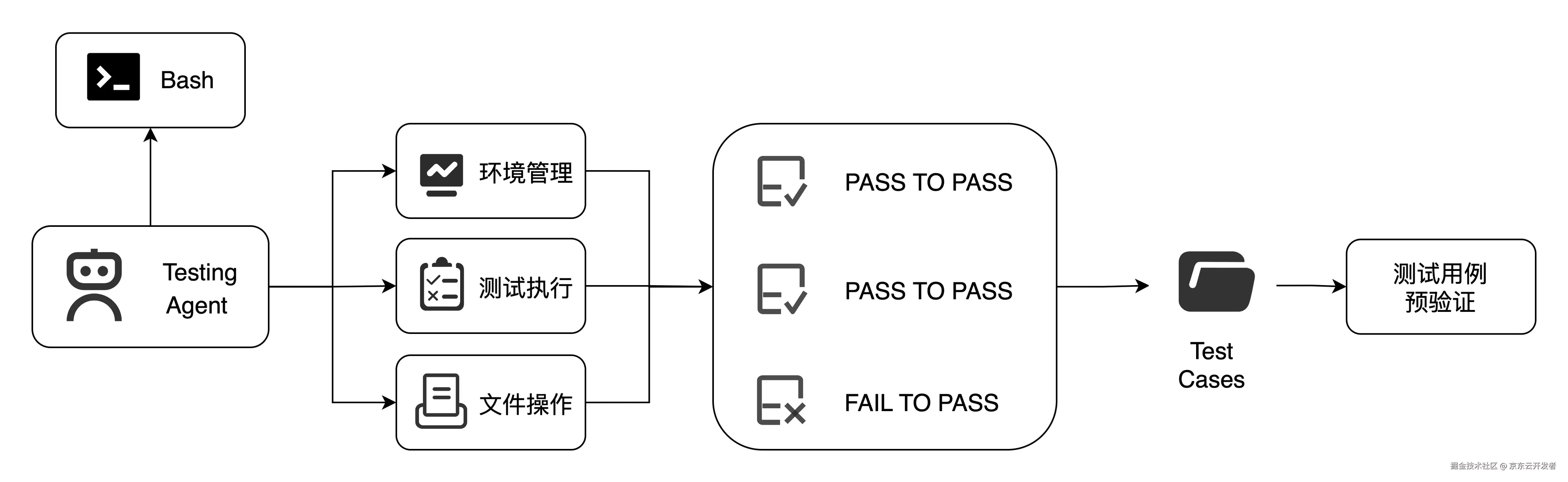 第一步,系统调用 Testing Agent 将问题描述转化为可执行的测试基准。在实现层面,Testing Agent 可以通过 Bash 工具完成依赖安装、环境检测、测试文件的创建与写入等,并最终生成包含两个 PASS TO PASS 和一个 FAIL TO PASS 的测试矩阵。生成后会立即进行预验证,以确保生成的测试用例满足“一败两通”的结构规范。