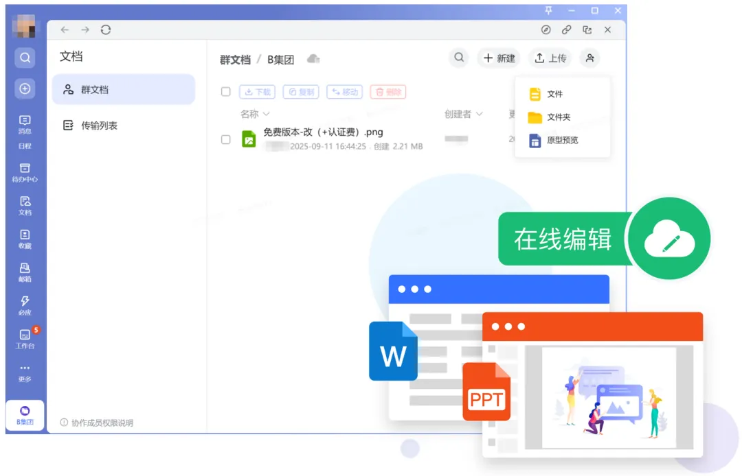 传统的微信群聊在文件管理上往往显得力不从心——重要文档被淹没在海量聊天记录中,查找困难,版本混乱。BeeWorks 为每个群组配备独立「群网盘」,成员可随时上传会议纪要、项目文档等至群组空间,实现文件集中存储与版本管理,让资料井井有条、随时可取,不再散落丢失。