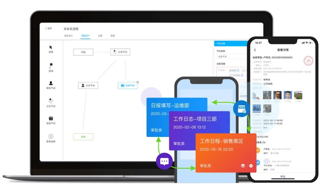 BeeWorks 提供灵活高效的智能流程引擎与可视化设计器,支持条件分支、并行审批、动态分支及会签、加签等复杂场景,可配置自动规则,轻松应对严谨多变的审批需求,大幅提升流程效率。