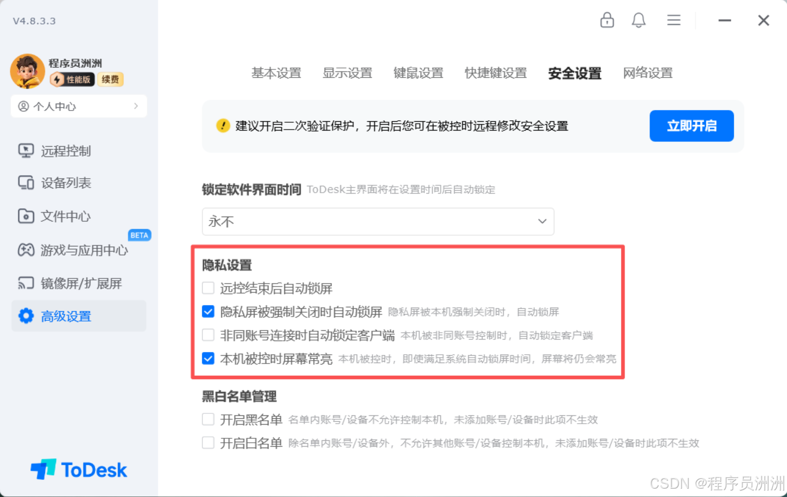 另外 ToDesk 还提供了几个隐私设置,远控结束后自动锁屏,这一项可以让不知道锁屏密码的人用不了;隐私屏强制关闭时自动锁屏;非同账号连接时自动锁定客户端,都可以根据安全保护的程度进行对应设置。