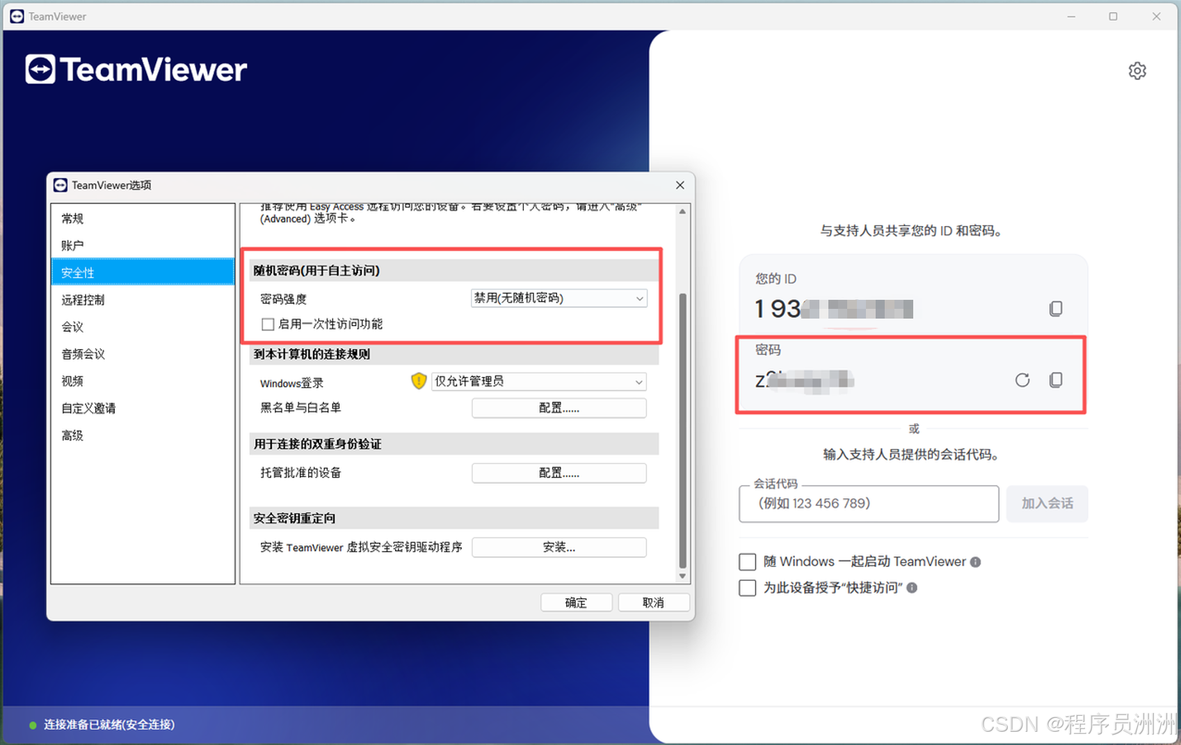 TeamViewer 也提供了对应的密钥连接,但是只提供了随机密钥,没有长期密钥/安全密钥选项,也没有密码更新的频率选择。这一点相比 ToDesk 要差一些。