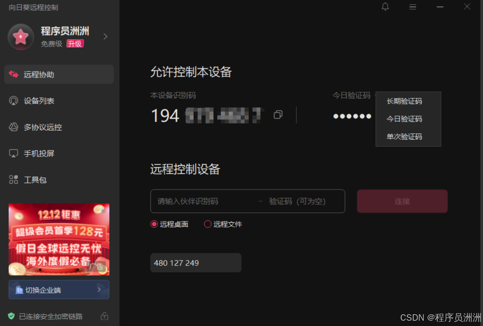 向日葵提供了 3 种连接密码,分别是单次/今日/长期验证码,但没有 ToDesk 选择的密度和考虑的周全。
