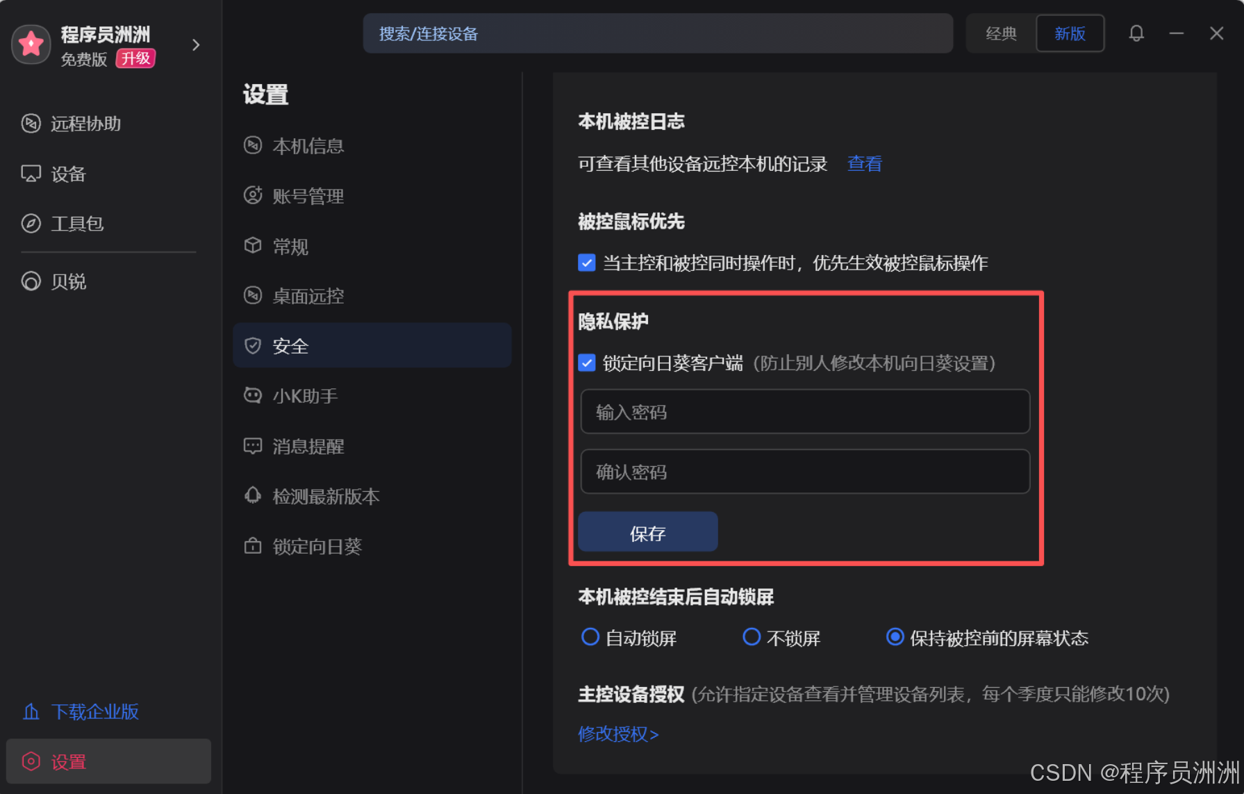 目前向日葵也提供了客户端锁定功能,这一点和 ToDesk 使用上的体验是一样的,也是能够锁定客户端防止他人进行远控信息修改或获取。
