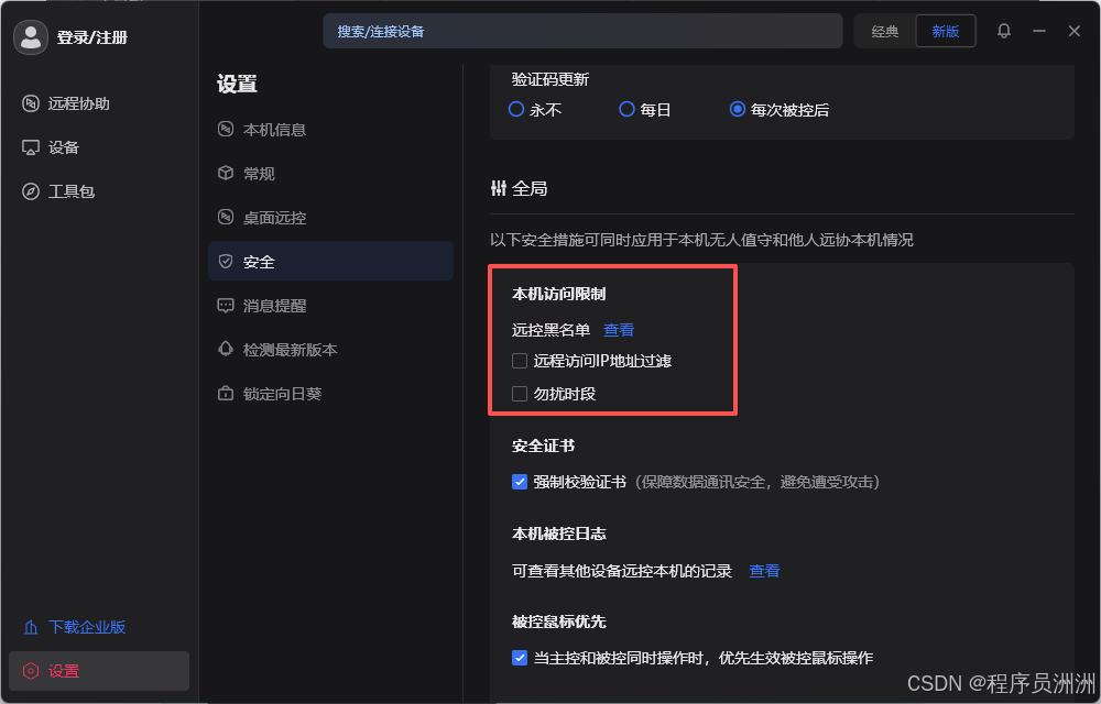 其次,是一般安全验证,包括 控制本设备的连接设置、控制本设备验证方式设置、历史连接密码保存设置、锁定软件界面时间设置、隐私设置、黑白名单设置等等。