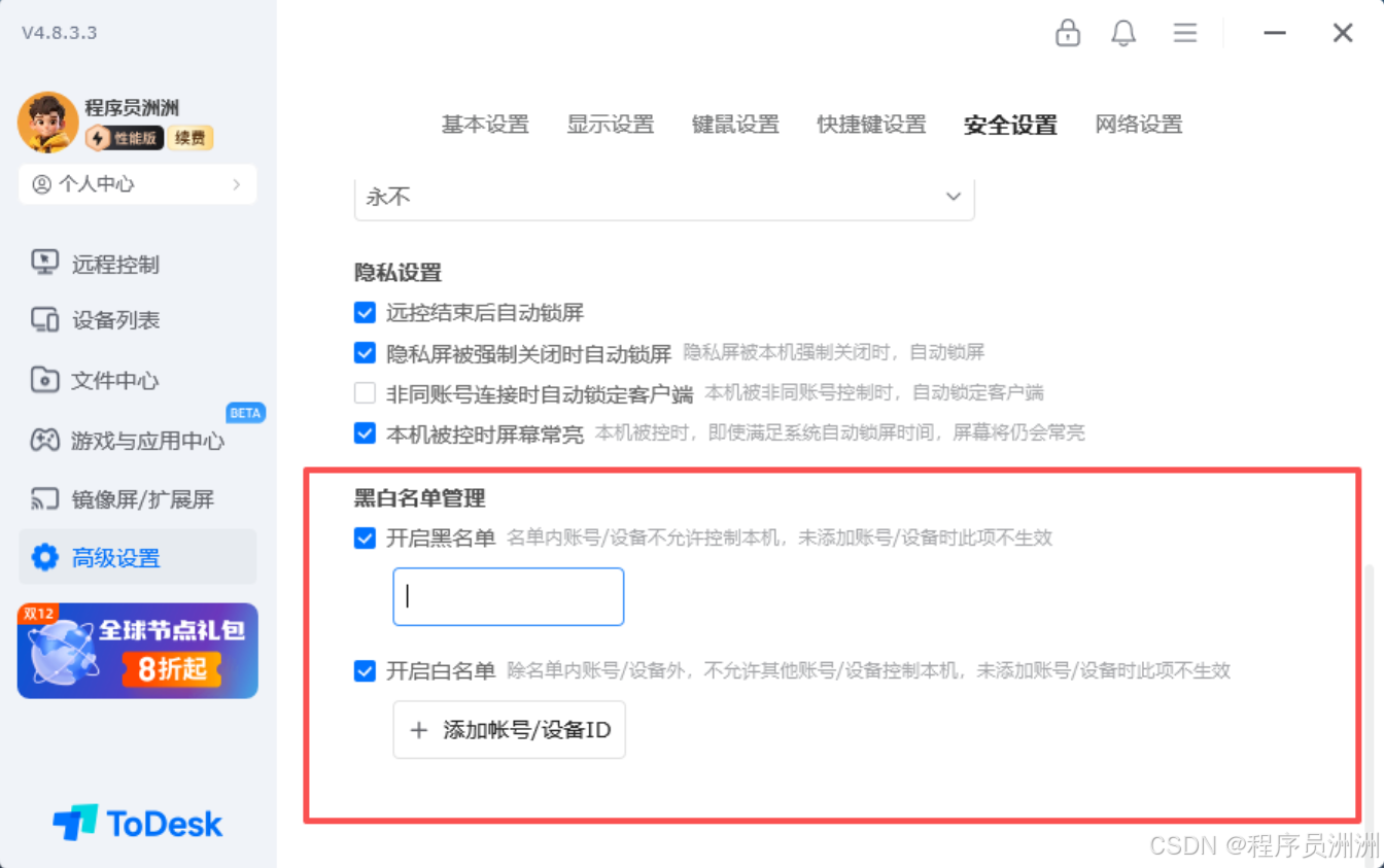“黑名单” 可添加指定账号或设备 ID,被列入名单的对象将无法控制本机,适合屏蔽已知的风险账号;而 “白名单” 则是 “仅允许指定对象访问” 的严格权限机制 —— 除了添加到白名单的账号 / 设备,其他所有对象都无法发起控制,相当于给远程权限上了 “专属锁”。