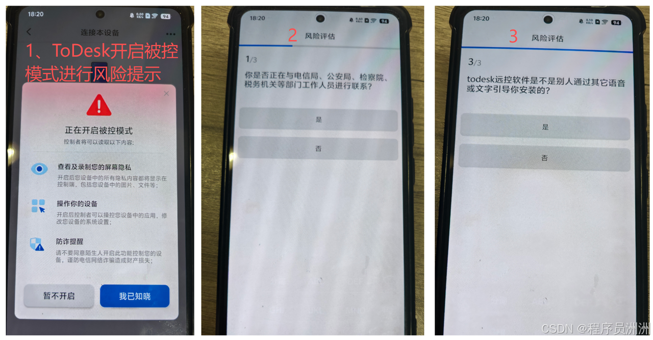 同时必须被控手机开启该功能,才可以进行远程控制。进行远控开启时,ToDesk 会进行一系列的远控安全提示与风险评估,提升用户的安全意识,帮助用户多个维度来审视真实使用场景下的安全度。