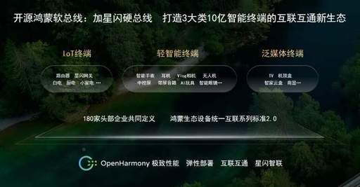 180 家头部企业正共同定义鸿蒙生态设备统一互联系列标准 2.0,加速开源鸿蒙软总线与星闪硬总线的深度协同,为多个终端品类互联互通注入创新动能。比如,IoT 终端如路由器、星闪网关、白电、厨电等设备之间,可以实现无感互联;智能手表、耳机、Vlog 相机、无人机等轻智能终端,通过开源鸿蒙+星闪达成低时延数据传输,在平板就能查看无人机拍摄的实时画面,革新消费终端体验;泛媒体终端则以 TV、机顶盒、智家云盒为代表,依托星闪+开源鸿蒙实现音视频跨端无缝流转。