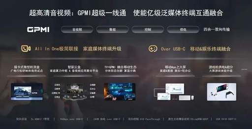 视听效果升级了,但设备之间的孤岛仍然存在。针对家庭媒体设备多线杂乱、跨终端互通壁垒、体验割裂等痛点,GPMI 超级一线通(General Purpose Media Interface),以音视频、数据、控制、供电四合一双向传输的极简联接能力,基于 USB-C 接口实现移动与娱乐终端深度融合,更以插卡式微型机顶盒、智家云盒、GPMI TV 等创新形态,带动移动 App 投屏办公、游戏机超分大屏畅玩、多设备无缝切换观影等需求高效落地。