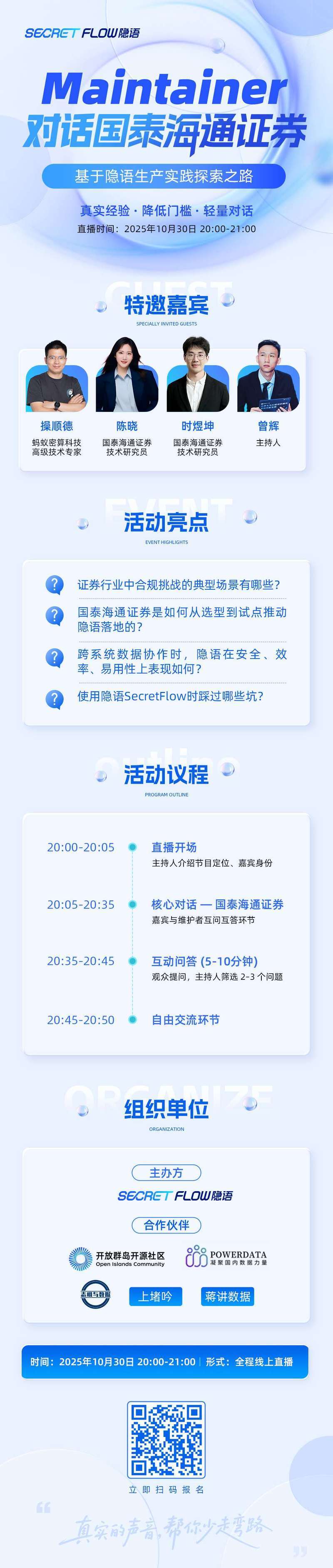 如果你正在推动金融行业的数据协同,正面临合规压力、技术选型难题,或是对隐私计算充满兴趣与探索,这期对话一定会给你新的启发。10 月 30 日 20:00,和国泰海通证券一起,走进隐语在隐私计算技术的探索之路。