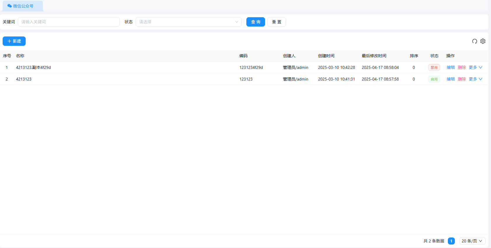 【微信公众号配置】页面支持搜索名称或编码关键词,及状态(禁用、启用)查询、重置、刷新、新建等操作