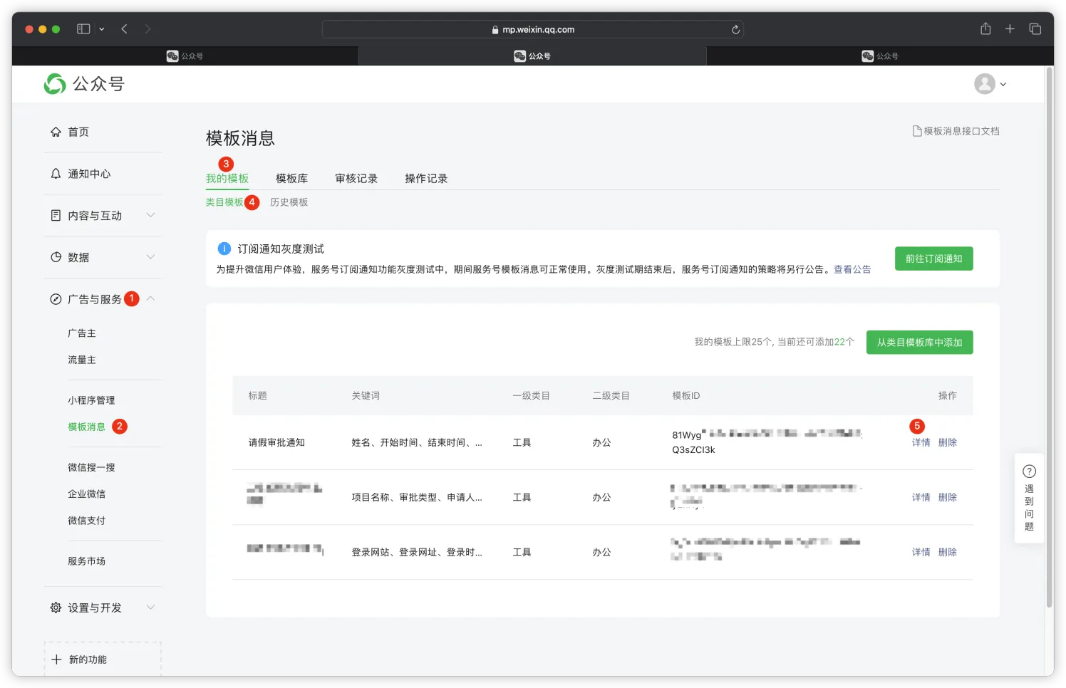 这里需要先登录微信公众号后台 > 广告与服务 > 模板消息 > 我的模板 > 类目模板,这里还是以【请假审批通知】模板为例,进入模板详情页面