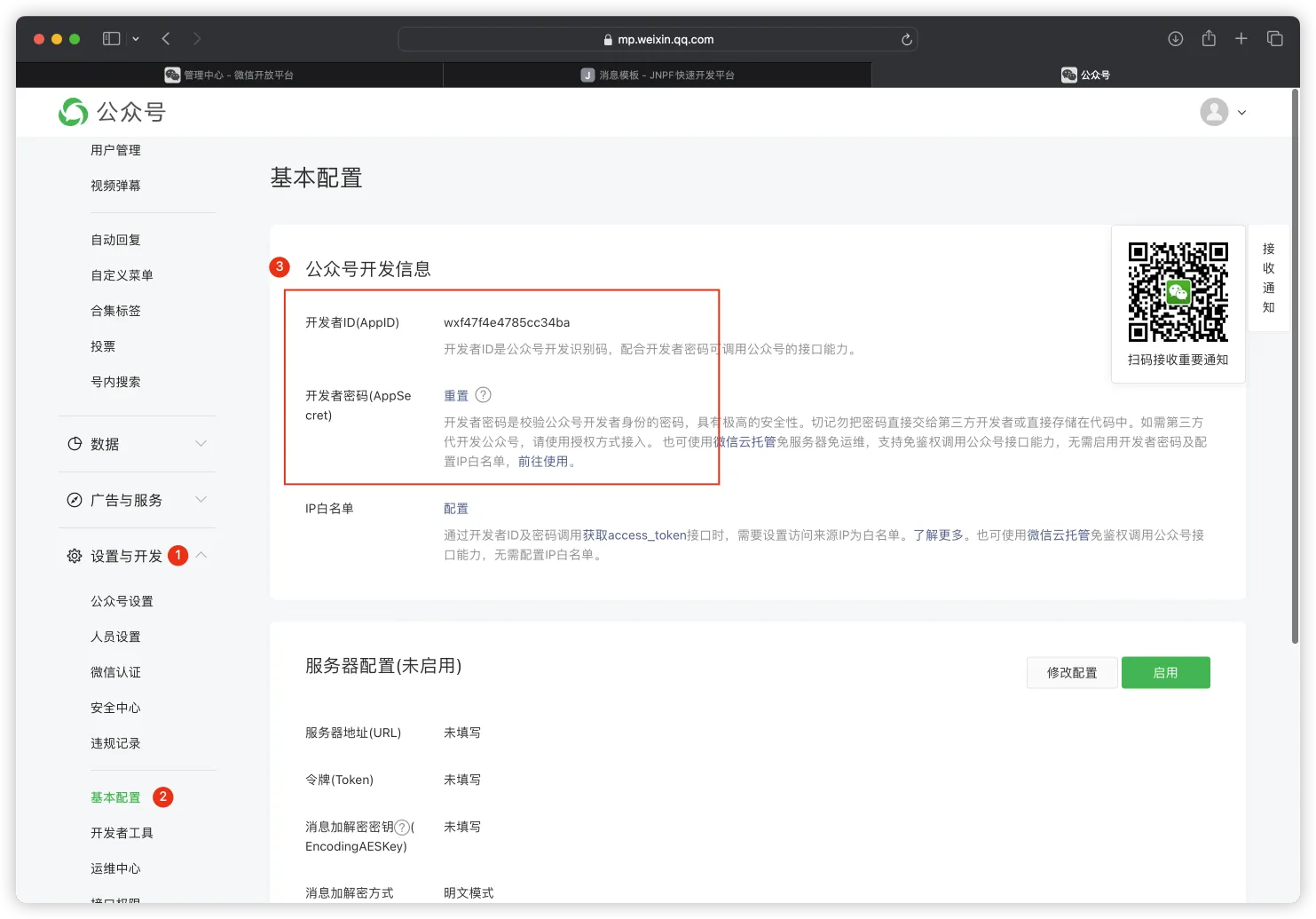 登录已申请的微信公众号后台,获得 原始 ID、AppID、Secret 这三个信息