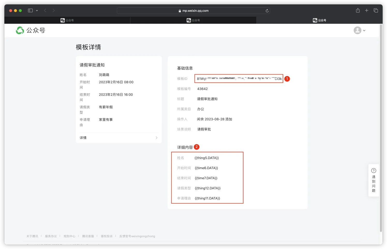 在【模板详情】页面中获取 模板 ID 和 模板相关字段 ,如下图所示