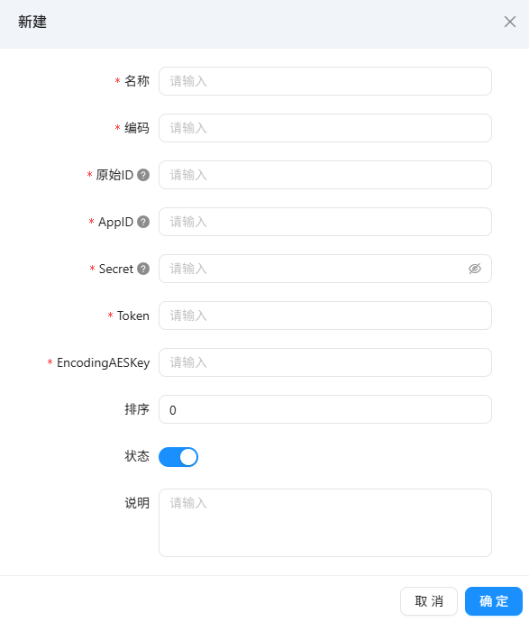 名称:定义账户的名称。编码:定义账号的编码,唯一性校验。原始 ID: 微信公众号注册原始 ID,唯一性校验。请在“微信公众号管理后台-设置与开发-公众号设置”页中获得 AppID:微信公众号的开发者 ID(AppID)。请在“微信公众号管理后台-设置与开发-基本配置”页中获得。Secret:微信公众号的开发者密码(AppSecret)。点击【眼睛图标】可以查看输入密码,默认密码用●代替。请在“微信公众号管理后台-设置与开发-基本配置”页中获得。Token:令牌(Token)EncodingAESKey:消息加解密密钥(EncodingAESKey)