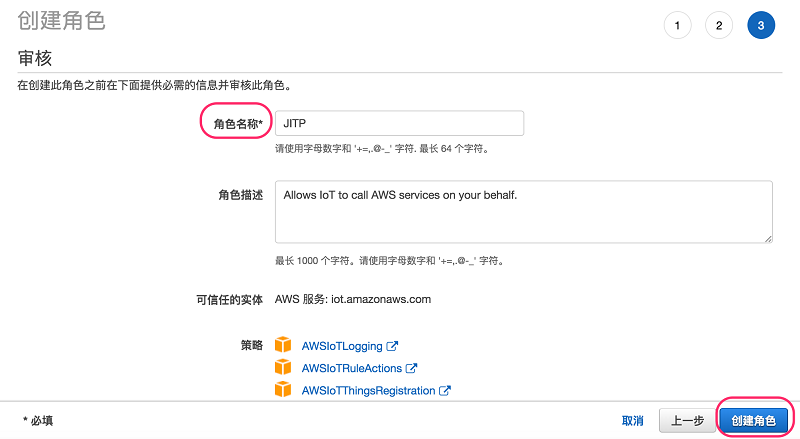 由于 JITP 是通过模版定义来注册设备证书和创建设备,因此模版中相应的权限必不可少。下面我们在 Amazon IAM 中来创建一个角色并赋予相应的权限。